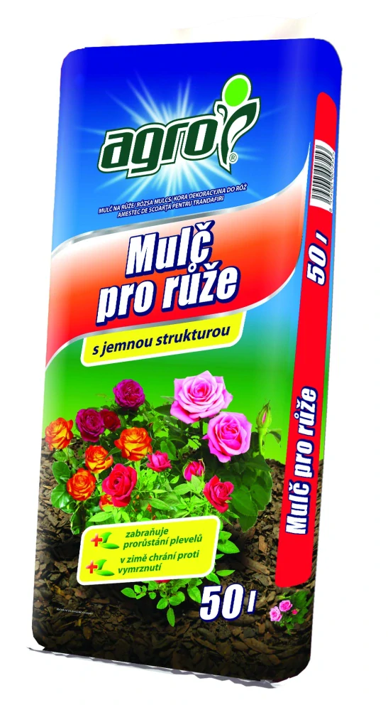 Agro mulčovací kůra pro růže slouží k dekorativnímu zakrývání ploch pod růžemi a jinými keři, kde spolu s mulčovací textilií zabraňuje prorůstání plevelů a v zimě zabraňuje promrzání rostlin a jejich kořenů. Základem mulče na růže je drcená a částečně zfermentovaná kůra jehličnatých stromů s rovnoměrnou jemnější strukturou pro snadné zpracování.