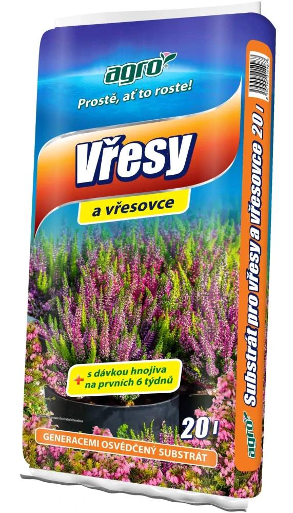 AGRO substrát pro vřesy a vřesovce substrát vhodný na vřesy, vřesovce a jiné kyslo-milné rostliny pěstované v záhonu nebo v nádobách.. Obsahuje speciální strukturu s upraveným pH pro bohatší tvoru květů a optimální složení pro zdravý růst. S dávkou hnojiva na prvních 6 týdnů.