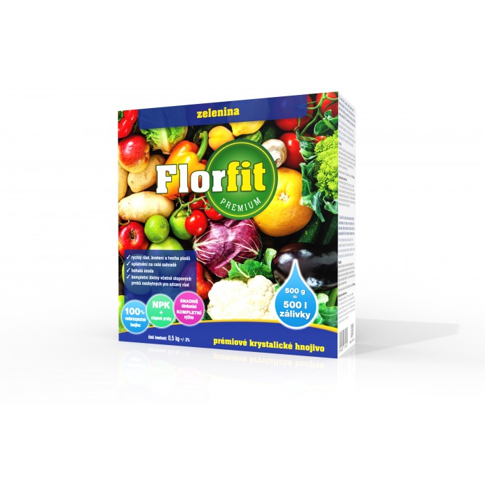 Hnojivo Florfit „Zelenina“ je krystalické vodorozpustné hnojivo s odměrkou. Ideálně zásobuje rostliny živinami potřebnými k růstu rostlin a vývoji chutných a šťavnatých plodů. Rostliny jsou zelenější, více kvetou a plodí. Tento produkt obsahuje NPK, Mg a kompletní řadu stopových prvků. Hnojivo Florfit „Zelenina“ lze použít pro rajčata, okurky, papriky, salát, kedlubny, ředkvičky, mrkev, petržel, cibuli, česnek, květák, kapustu, pórek, celer, hrách, lilek, ale i pro drobné ovoce (jahody, maliny, angrešt, rybíz, révu…) i pro okrasné rostliny (růže, tulipány, floxy, okrasné dřeviny…).