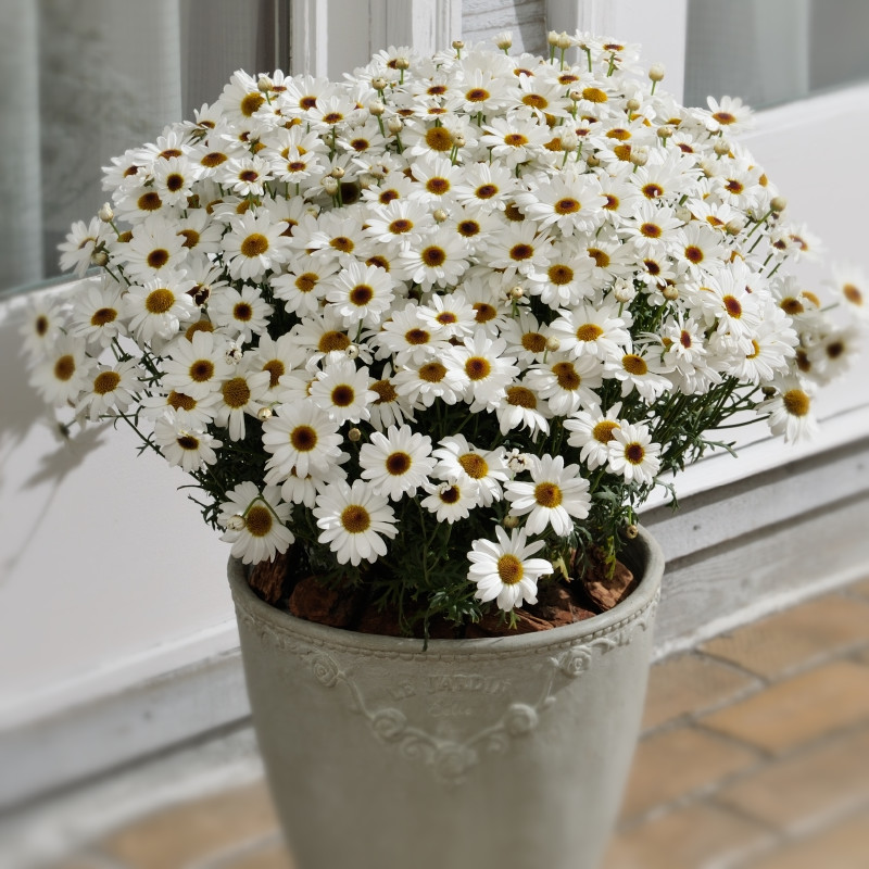 Kopretina pařížská 'Grandaisy Ivory Halo' je okrasná trvalka, která zaujme svou krásou a nenáročností na pěstování. Díky svým atraktivním květům a okouzlujícím listům s bílým okrajem je skvělou volbou pro každou zahradu. Tato odrůda je nejen krásná, ale i poměrně snadno udržovatelná, což ji činí ideálním doplňkem k trvalkovým záhonům a okrasným výsadbám.
