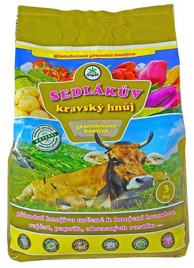 Sedlákův kravský hnůj je peletované organické hnojivo vyrobené z fermentovaného kravského hnoje. Obsahuje organické látky – bio-masu, základní živiny N, P, K, Ca a Mg, ale i stopové prvky např. Fe, Mn, Mo, Zn, Cu, které jsou přirozenou součástí kravského hnoje.