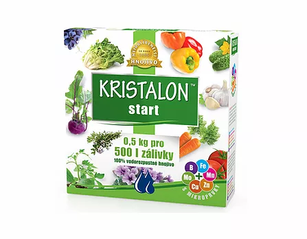 KRISTALON Start je krystalické ES hnojivo, vodorozpustné a určené pro rychlejší start v počátečním růstu a dále v produkčním období rostlin. Kristalon je univerzálně použitelný pro zeleninu, okrasné rostliny včetně balkonových, cibuloviny, drobné ovoce i ovocné stromy. Zamezuje žloutnutí listů.