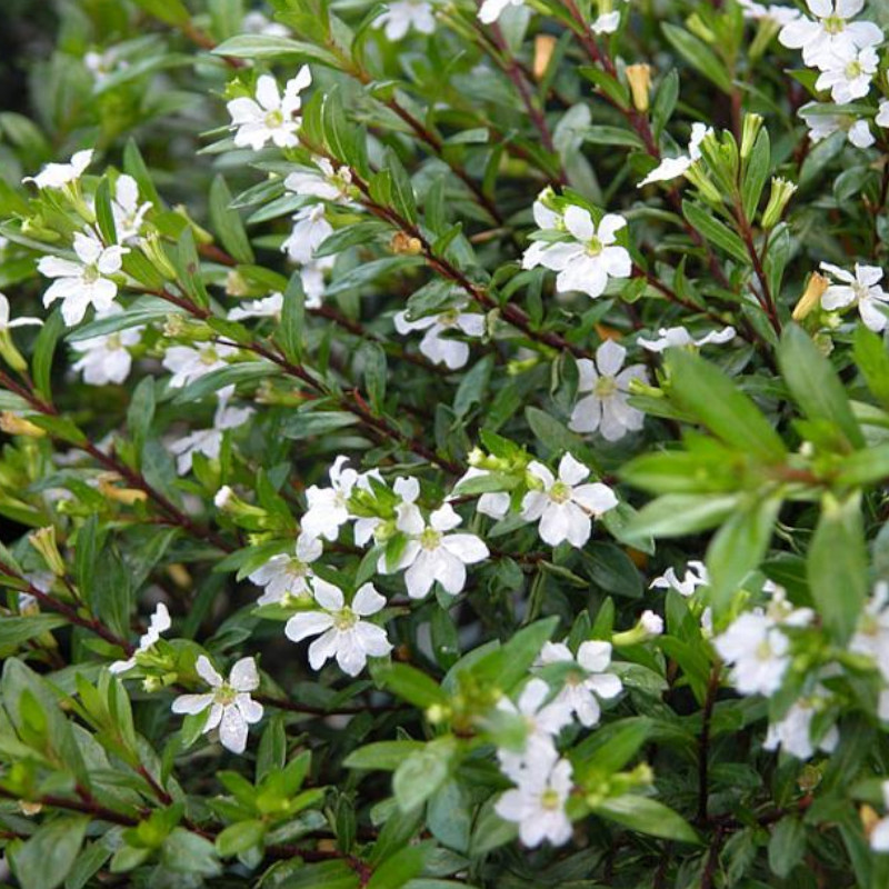 Bílá varianta mexického vřesu přidává eleganci a svěžest do každé výsadby. Její jemné květy přitahují opylovače, jako jsou motýli a včely, a zároveň působí nenápadně, což ji činí vhodnou pro minimalistické zahradní kompozice.