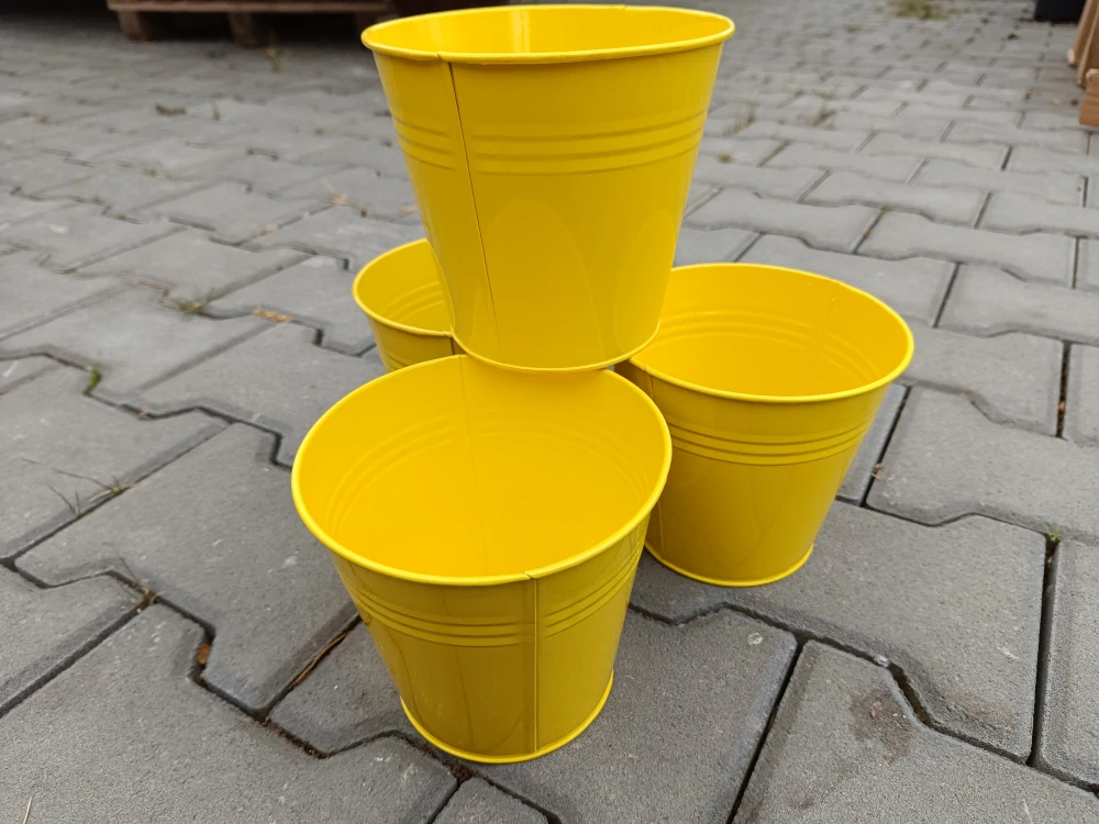 Plechový dekorační obal na kvetináč - kulatý - vrchní průměr 14 cm, výška 14 cm - žlutý ve tvaru kbelíku
