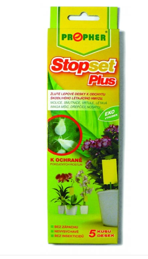 Žluté lepové desky jsou určeny k odchytu škodlivého létajícího hmyzu (molice, smutnice, vrtule, létavá imaga mšic atd.). Malé rozměry umožňují snadné použití k ochraně pokojových rostlin. Desky 20 x 5 cm se přeloží a zasunou do plastového úchytu zapíchnutého do zeminy. Na větší rostlinu je možno desku zavěsit pomocí přiloženého závěsu. Lepové desky je vhodné použít preventivně ihned po přesazení, aby nedošlo k přemnožení škůdců. Souprava obsahuje 5 ks lepových desek, 3 ks plastových úchytů a 2 ks závěsů. Výhodou STOPSETU PLUS je snadná manipulace s lepovými deskami.