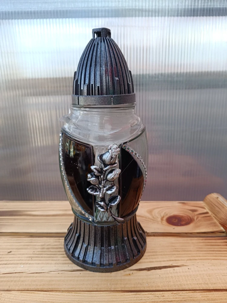 - Svícen hřbitovní - stříbrná r. 26.5cm sklo/plast
